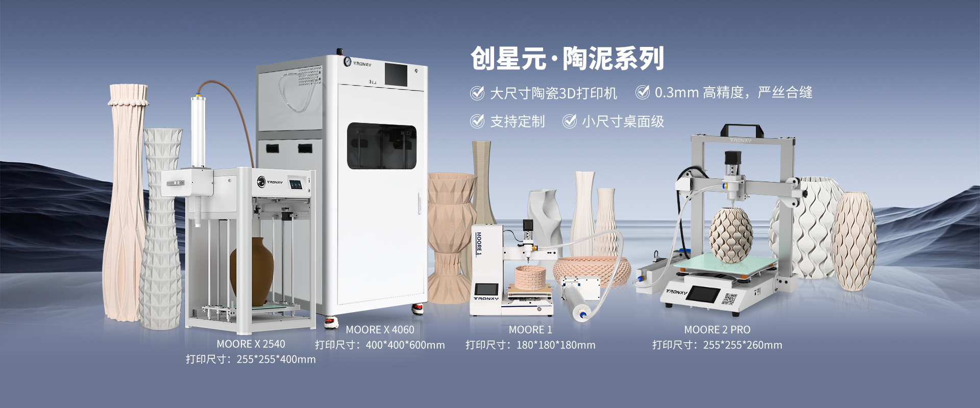自主設計,定制生產線,可生產從桌面級到工業級等 尺寸從180mm到1.6米3D打印機